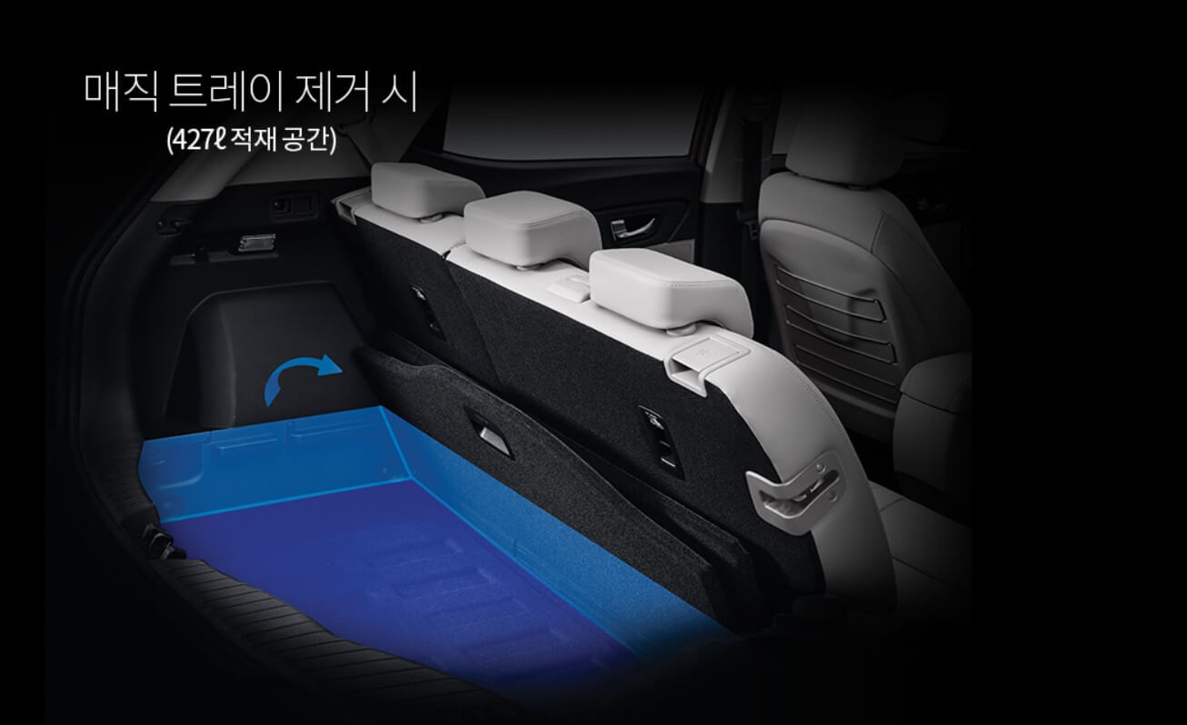 A6. 427리터의 기본 트렁크 공간이 제공되며, 2열 시트를 접을 경우 넓은 적재공간 확보가 가능합니다.